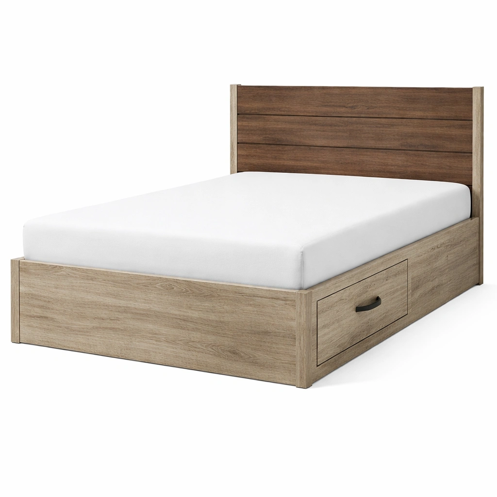 Cama con almacenamiento de madera con cabecera y cajón roble claro marrón oscuro