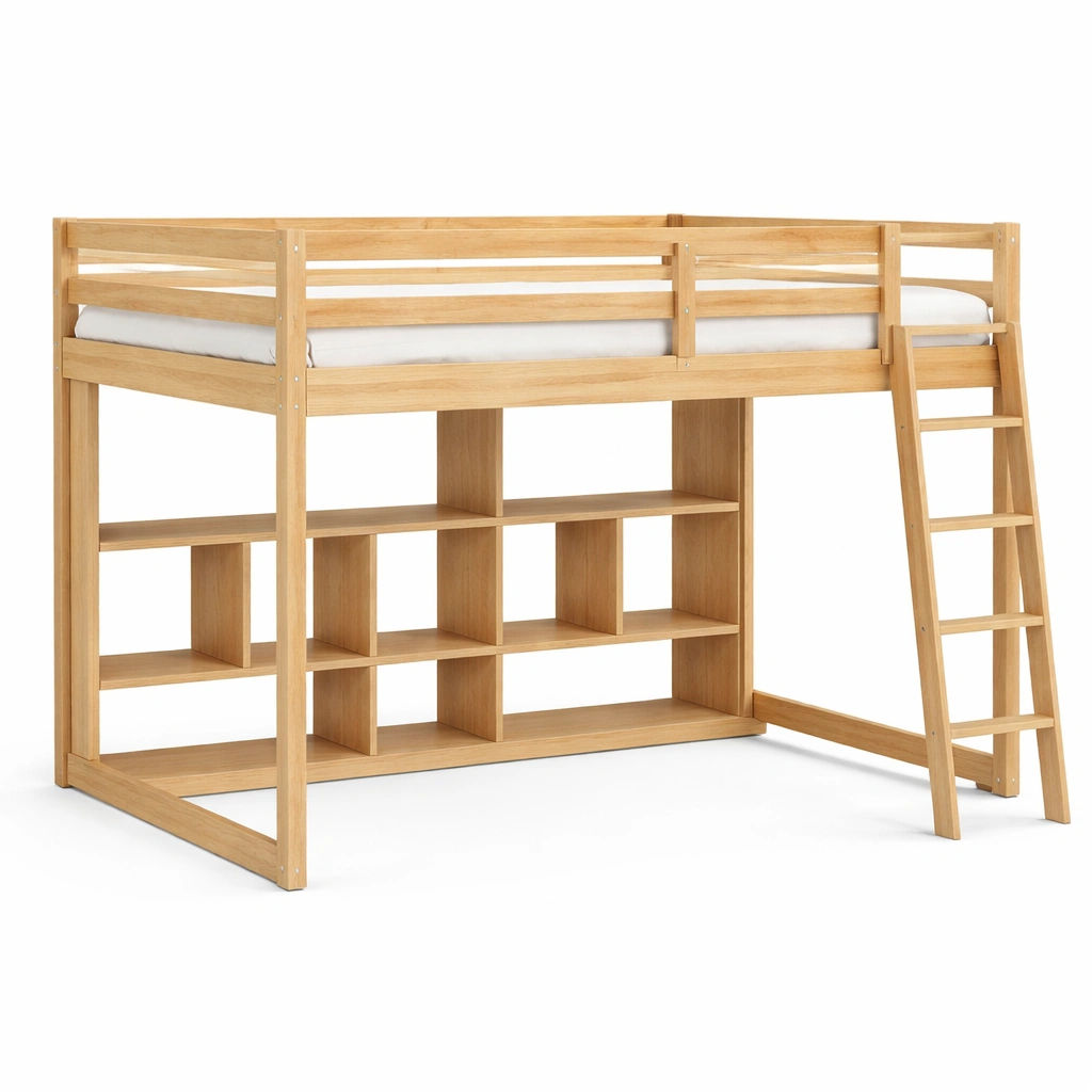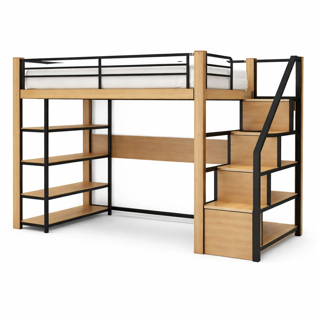 Cama loft de madera y metal con escalera y estantes