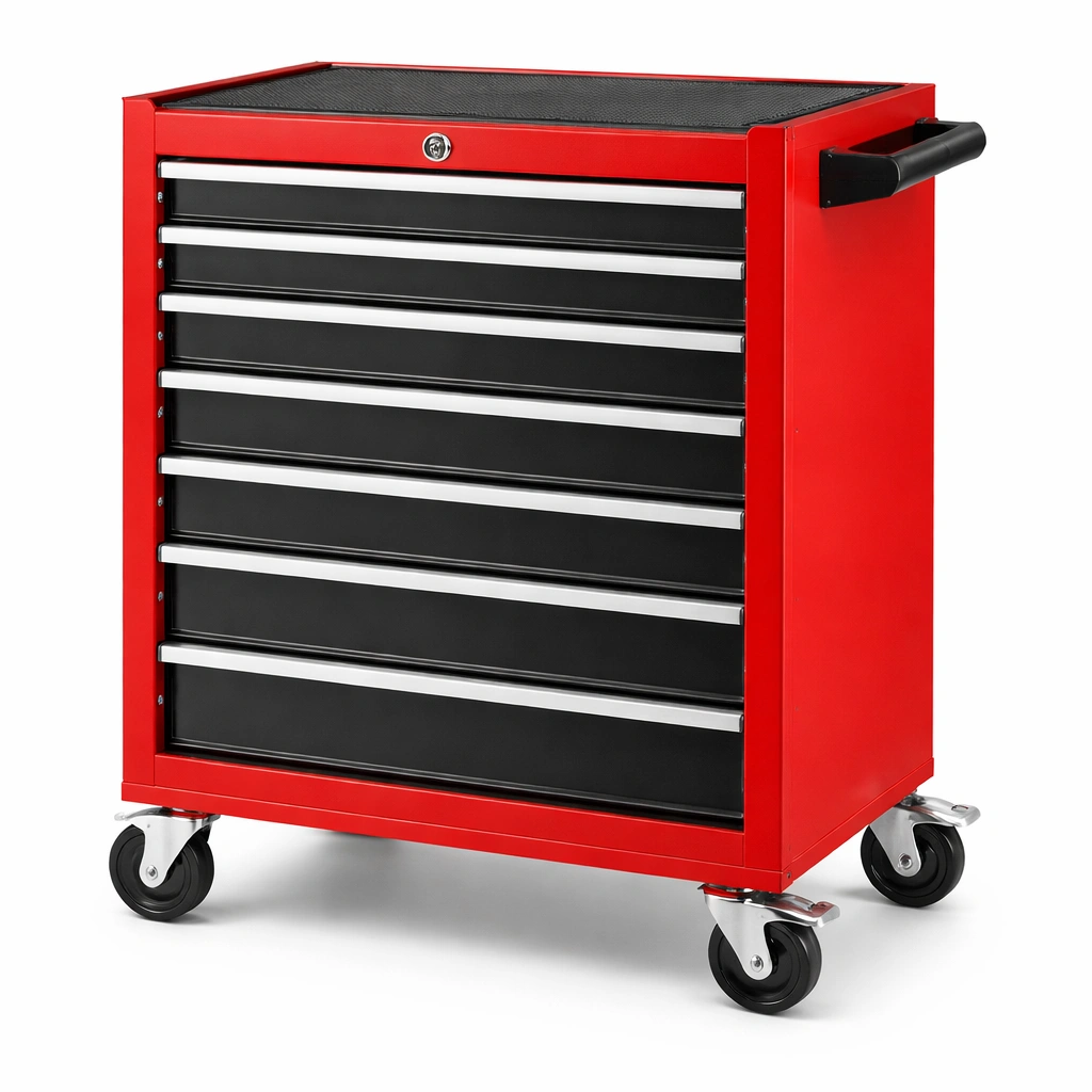 Carro de herramientas de acero rojo y negro con 7 cajones