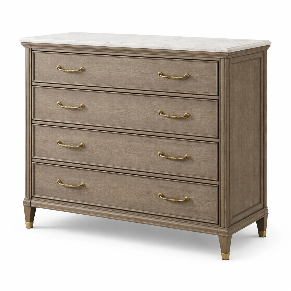 Esta cómoda está fabricada en madera de roble y cuenta con una encimera de mármol. Incluye cuatro cajones con tiradores de metal dorado.